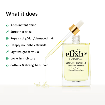 Elixir Naturals is a women-owned hair care brand rooted in intentional hair rituals that nourish from root to tip—because hair wellness is the foundation to your best hair days. Inspired by nature, our Ultimate Nourishing Hair Oil repairs, nourishes, and strengthens hair while taming frizz and enhancing shine.